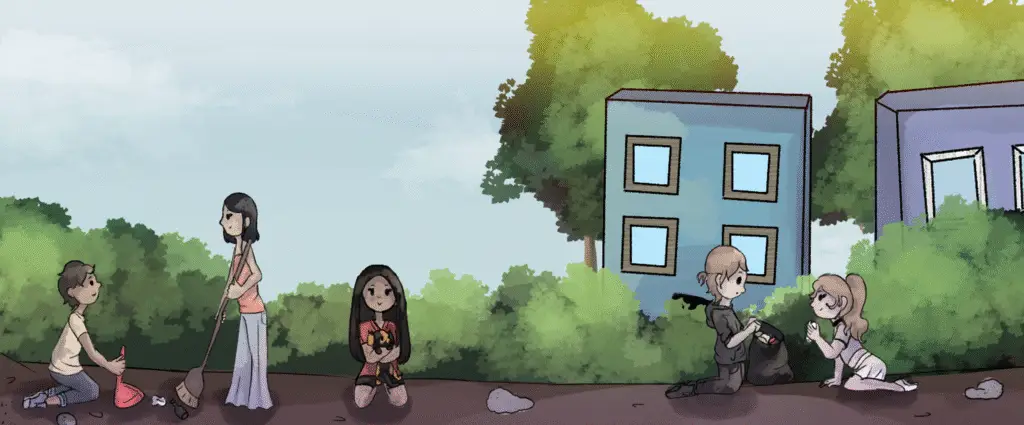 Una ilustración con estilo simplificado, ideal para destacar personajes de forma clara y amigable, acompañados de un fondo detallado y trabajado, que añade riqueza visual y contexto a la escena.